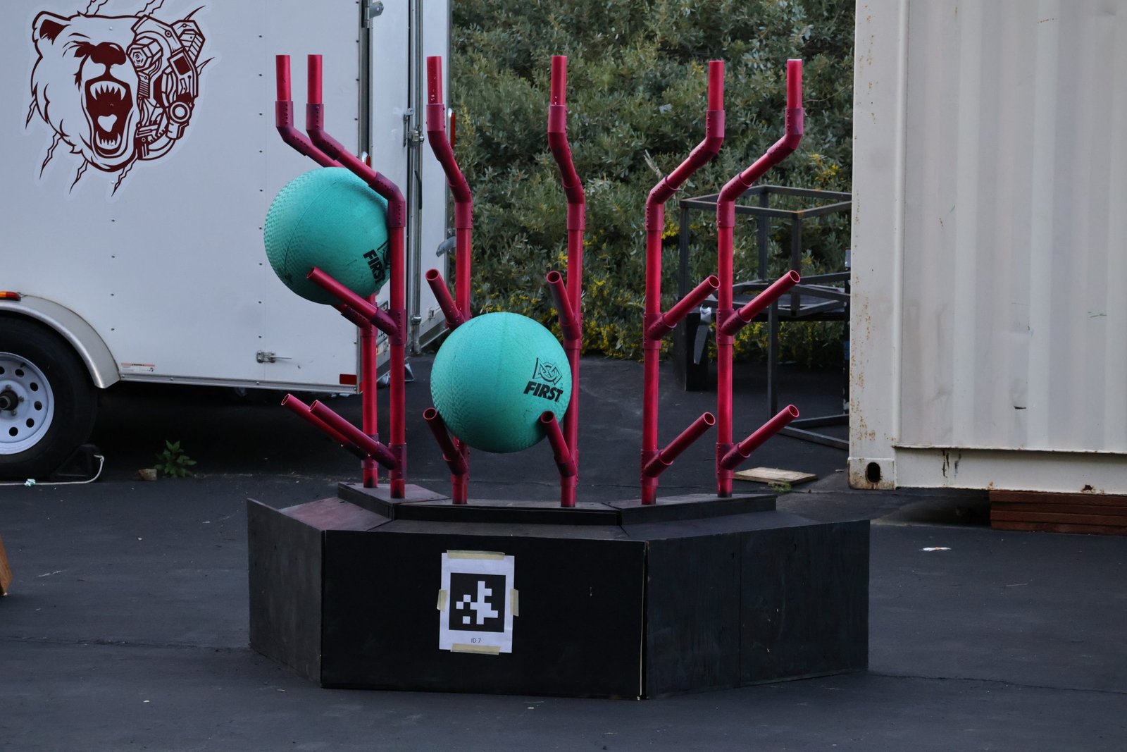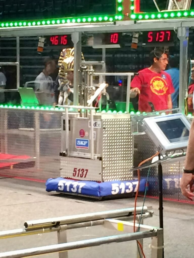 The 2022 game was themed around transportation. As the match commences, the goal of each alliance is to shoot Cargo (inflatable balls) into the Central Hub which has two levels. In the end, robots have the option to hang on a series of Hangars (bars) to end the game and get ahead of the other alliance.