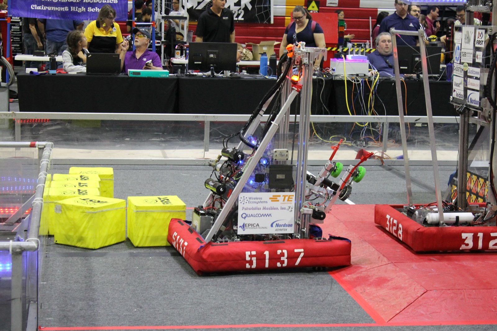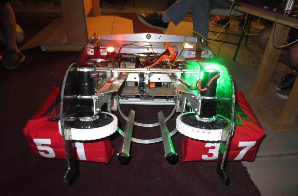 The 2018 game was themed around the idea of retro 8-Bit. To win points, robots placed Power Cubes (milk crates) on large balancing scales to make it tip to their advantage or teams could trade Power Cubes for temporary power ups in the match. At the end of the match, robots attempted to hang from a rung attached to the center of the tower.