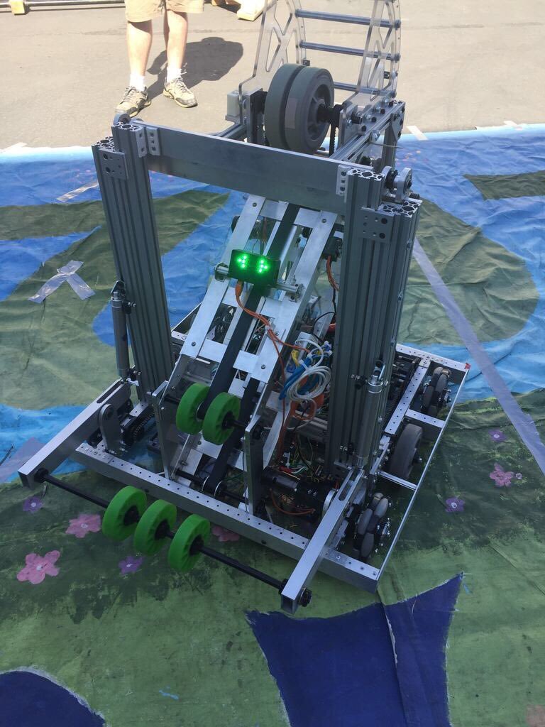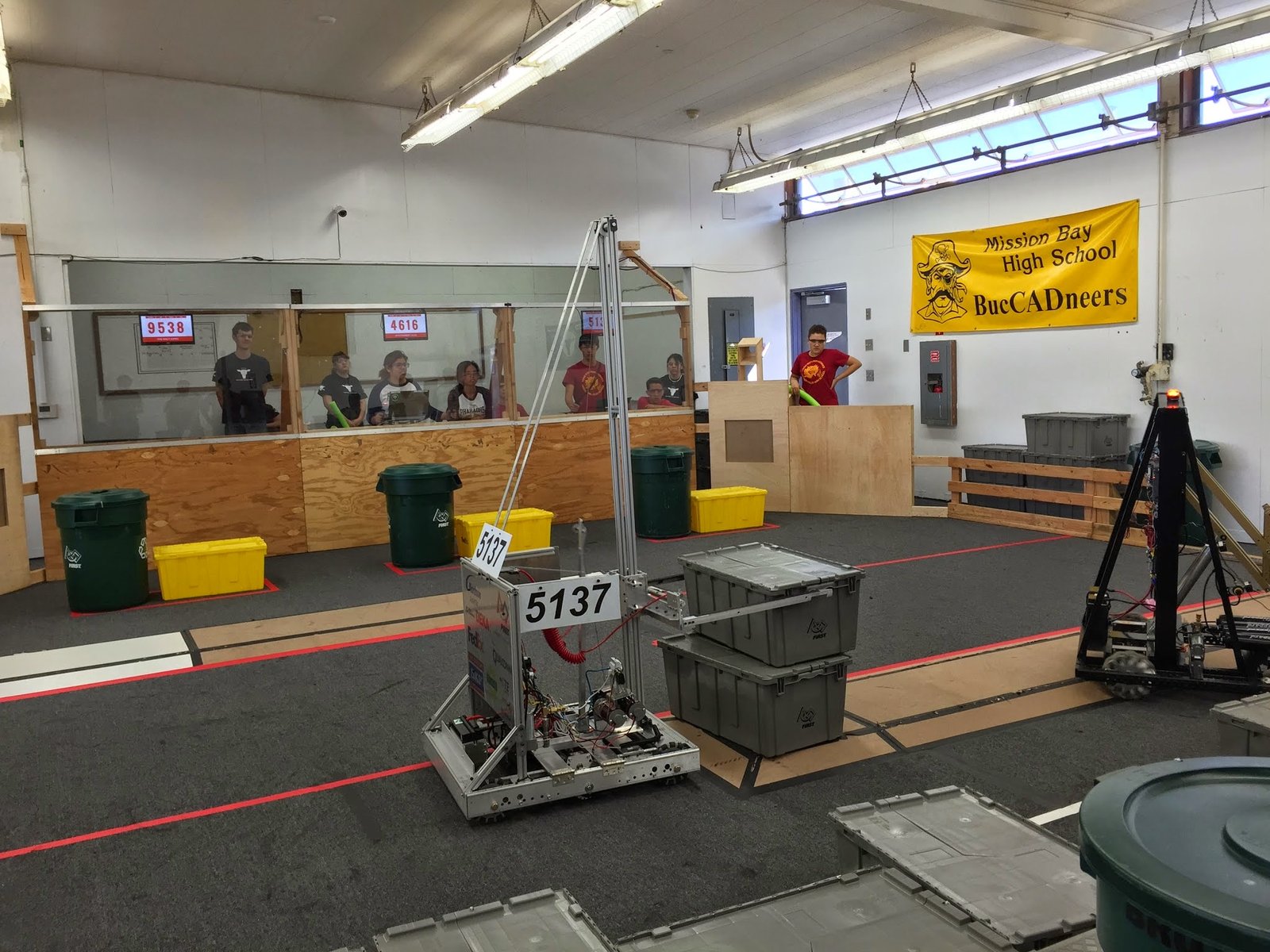 The 2015 game was themed around the idea of recycling. Robots were tasked with picking and stacking Tots (storage containers) on different levels of scoring platforms, putting Litter (pool noodles) inside Barrels (recycling containers), and then placing the Barrels on scored Totes.