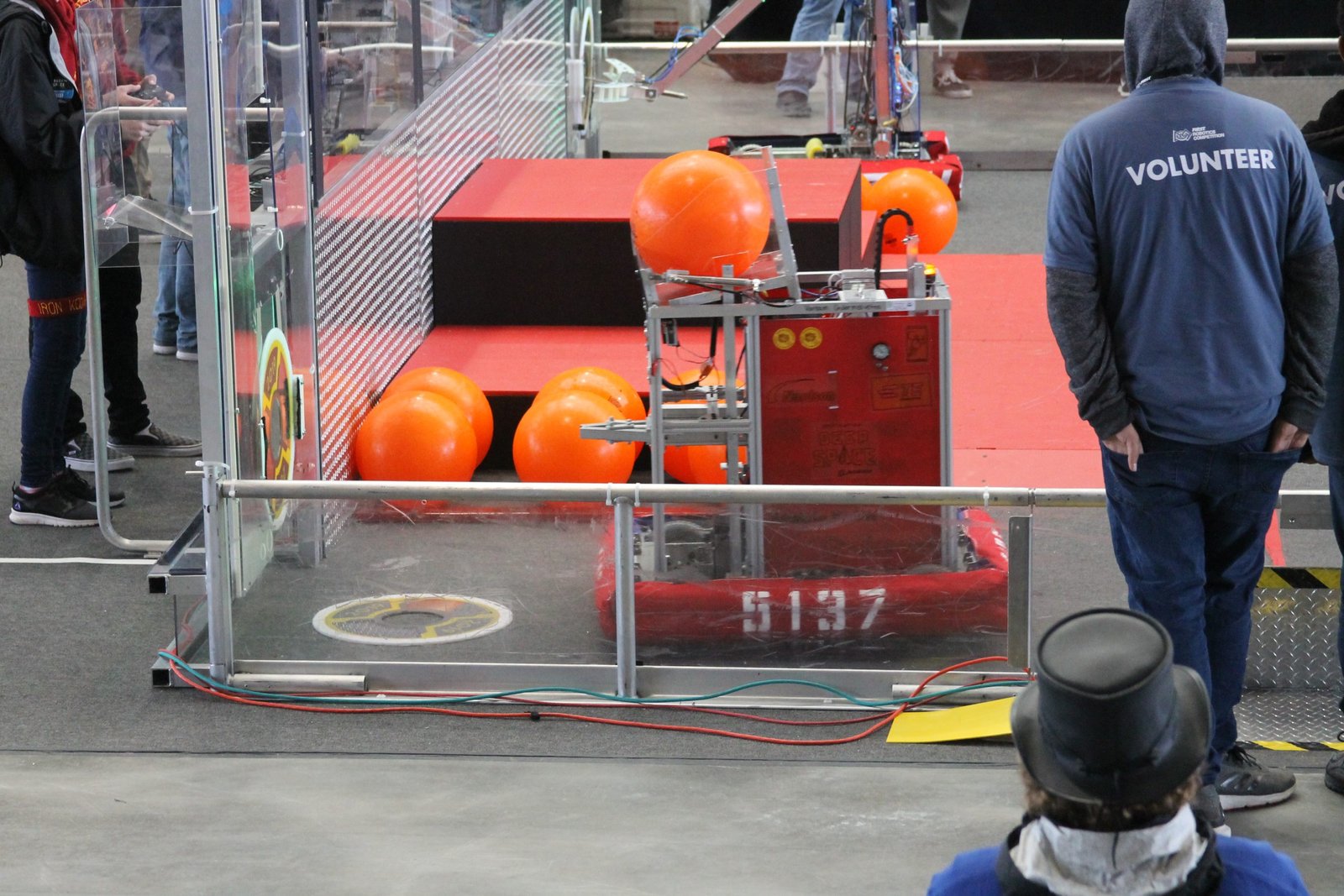 The 2017 game was themed around the idea of steampunk. Robots were expected to shoot Fuel (wiffle balls) into a Boiler (smokestack) which then transported it to the Airship (middle stage). Points are also won by loading the Airship with Gears. Similar to other FRC games, at the end of the match robots could climb and hang onto ropes attached to the Airship.